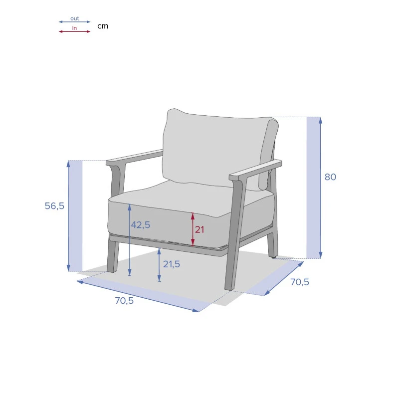 Conçu spécialement pour l’extérieur, la structure du fauteuil est en aluminium traité époxy antirouille et ses coussins en tissu déperlant sont déhoussables pour un entretien facile.