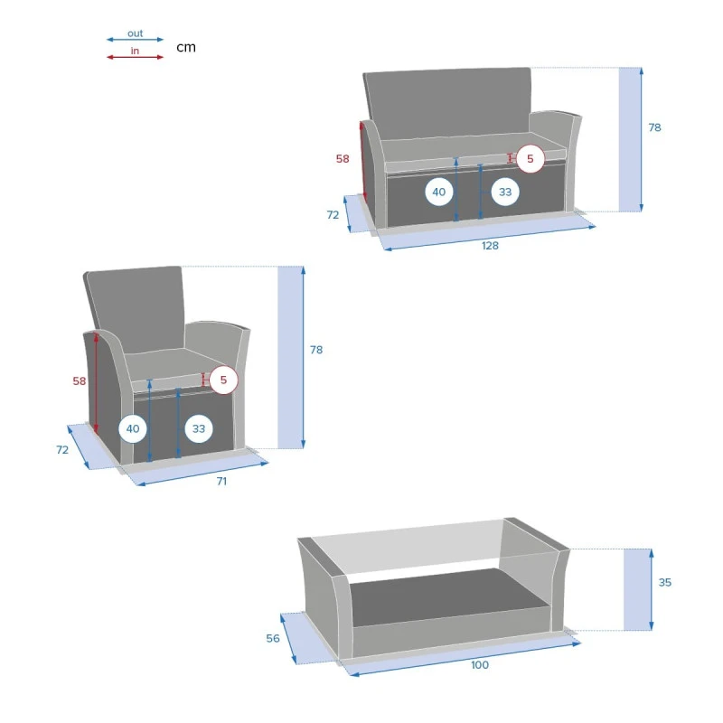 Salon complet composé de 1 canapé 2 places (128x72xH78 cm) + 2 fauteuils (71x72xH78 cm) + 1 table basse (100x56xH35 cm).